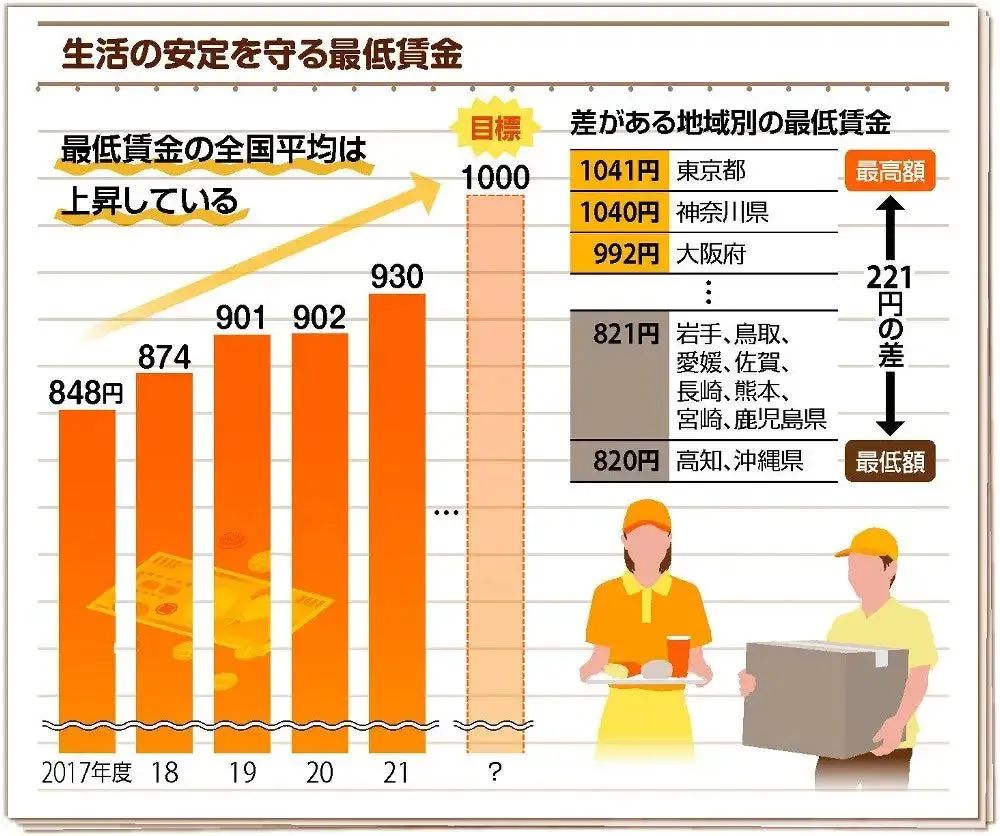 據(jù)日媒報(bào)道,關(guān)于提高最低工資,日本政府?dāng)M將力爭(zhēng)2025年度實(shí)現(xiàn)全國(guó)平均時(shí)薪達(dá)到1000日元(約合人民幣51元)以上這一目標(biāo),寫(xiě)入“新資本主義執(zhí)行計(jì)劃”的進(jìn)度表中。