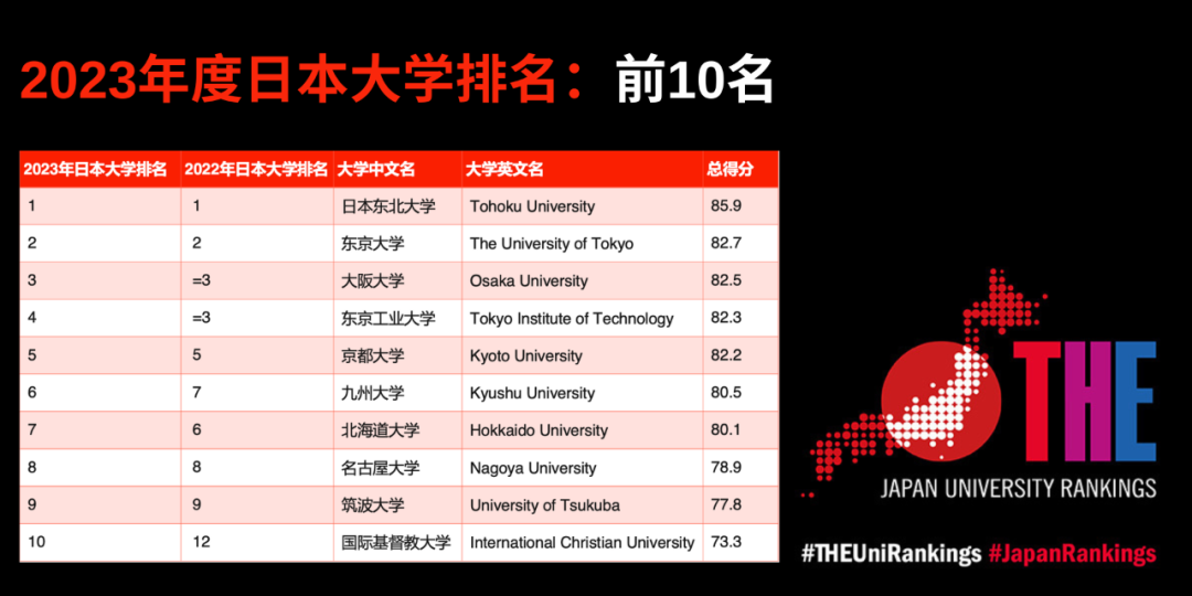 在綜合排名中,日本東北大學連續第四年排名第一。東京大學再次排名第二位。2022年度并列排名第三名的大阪大學和東京工業大學分列第三和第四位。九州大學排名第六,從去年的第七攀升了一位。國際基督教大學今年首次進入前十名。