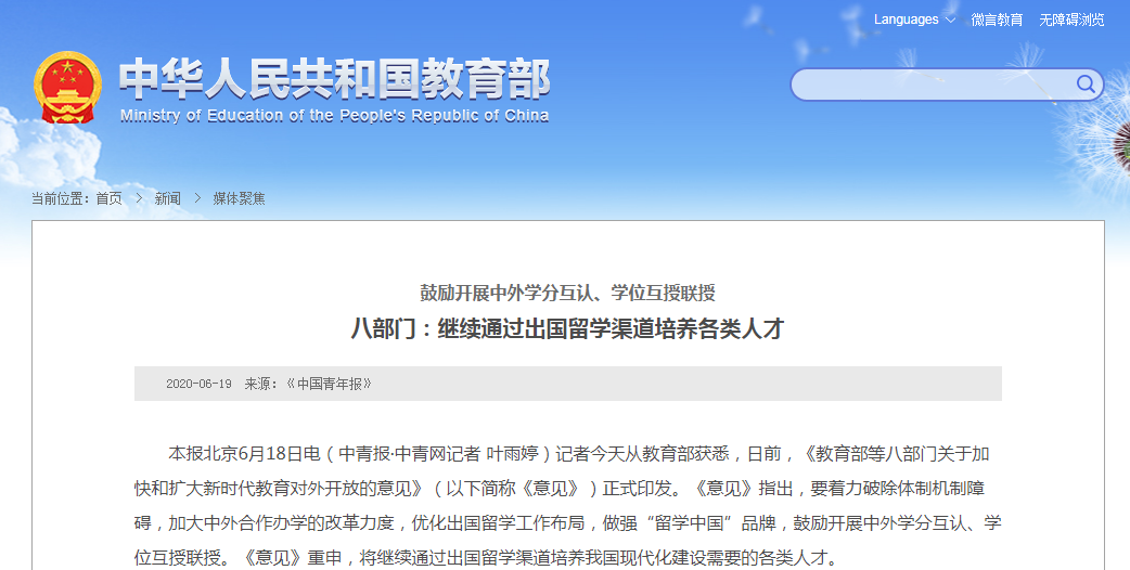 教育部:繼續通過出國留學渠道培養各類人才
