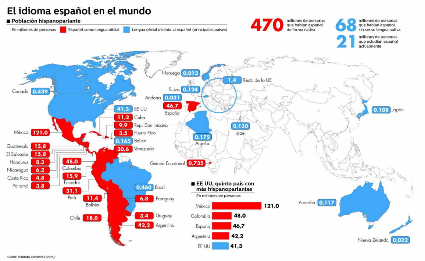 全世界的潛在西班牙語使用者超過5.8億人,因此西班牙語成為僅次于英語和漢語的全球使用者第三多的語言。