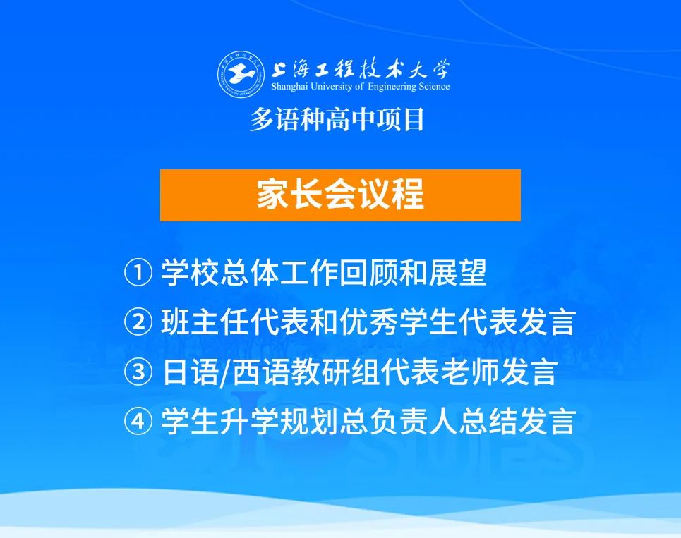 為總結2022-2023學年第一學期學校總體工作,做好新學期開學準備,上海工程技術大學多語種高中項目于2月8日圓滿舉行了全體學生的線上家長會。會議由我校負責教學教務管理和升學規劃總協調工作的陸老師主持。