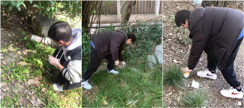 我們先來(lái)到了校園的小樹(shù)林,這里景色宜人,金色的陽(yáng)光透過(guò)嫩綠的新葉照射下來(lái),綠意澄澈到心底。綠蔭下的涼亭給校園增添了幾分詩(shī)情畫(huà)意,還有幾只貓懶洋洋地臥在柔軟的草叢中休息。在溫暖的春日暖陽(yáng)下,我們撿拾起了少許的紙團(tuán)和塑料空瓶,用干凈的抹布擦去亭子上的塵土,令它露出了鮮亮的本色。打掃完后,同學(xué)們仔細(xì)地檢查,確認(rèn)完全收拾整潔后才前往下一個(gè)地點(diǎn)。