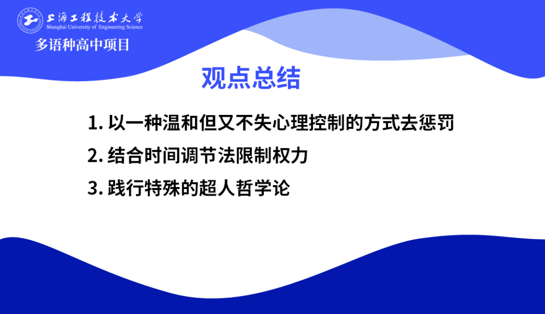 楊昕小組主要從欲望與規訓的角度分析了學生違規的原因,并探討了相應的懲罰手段。學生違規的原因在于欲望未被充分抑制,當欲望突破抑制的臨界點,就會做出違反規則的行為。這一組提出的措施是建議校長全面了解學生,以外界因素幫助學生壓抑減少欲望與沖動,以溫和的心理控制方式進行懲罰。