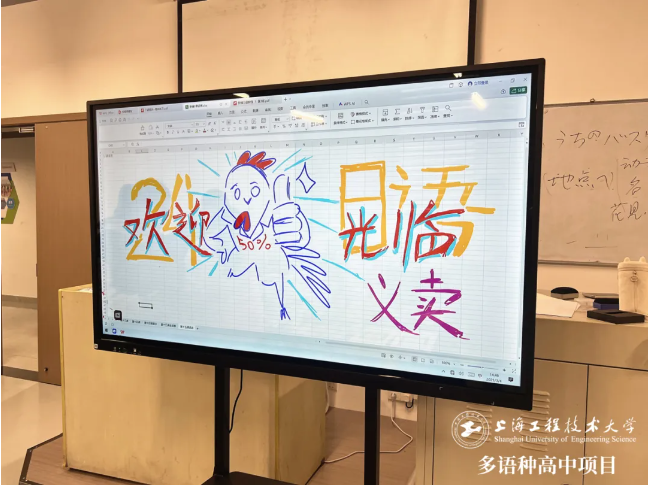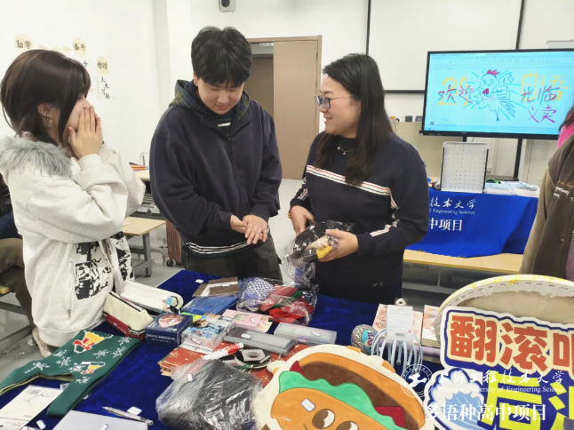 攤位前,學生們化身“職場達人”,在推銷、收銀、記賬等崗位上各展所長。為吸引“顧客”,各班奇招頻出:有的推出“買一送一”等促銷活動;也有熱衷Cosplay的同學送出親筆簽名照作為隱藏福利;也有同學帶上商品、走出班級,開展地推……中途,老師們也加入購買大軍,“化身為甲方”,只有答出“甲方”的語言問題,才有可能拿到尾款,課堂上學過的日語、西班牙語單詞在生活化的場景中強化了記憶。