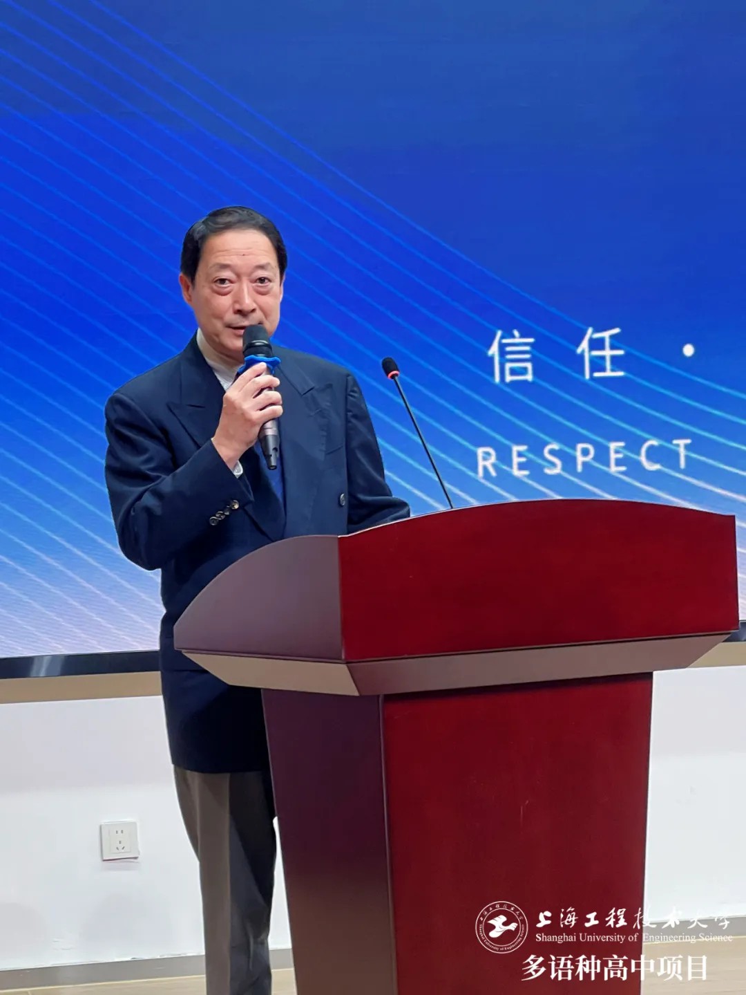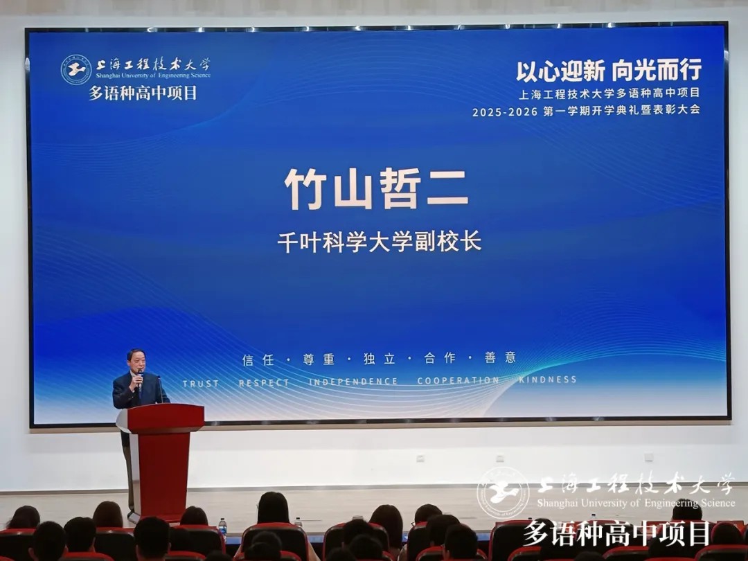 上海工程技術(shù)大學繼續(xù)教育學院吳剛副院長、學院老師代表,及多語種高中項目全體師生近300人齊聚現(xiàn)場,共啟新學年。本次活動還邀請了日本千葉科學大學副校長竹山哲二先生作為特別嘉賓到校出席。