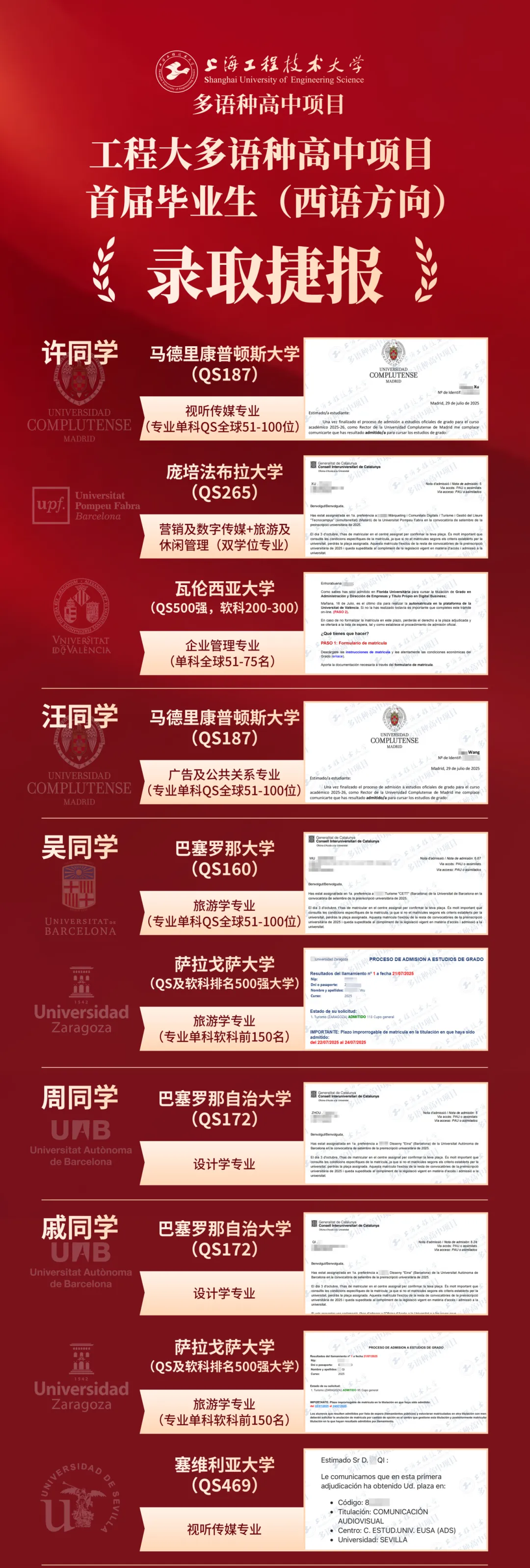 在西班牙方向,學(xué)生們表現(xiàn)尤為突出,錄取了包括:巴塞羅那大學(xué)(QS 160)、馬德里康普頓斯大學(xué)(QS 164)、巴塞羅那自治大學(xué)(QS 172)、龐培法布拉大學(xué)(QS 265)等世界頂尖院校,同時(shí),還攬獲了瓦倫西亞大學(xué)、格拉納達(dá)大學(xué)、塞維利亞大學(xué)、薩拉戈薩大學(xué)、阿利坎特大學(xué)等全球排名前500的歐洲知名公立院校的OFFER。錄取專業(yè)涵蓋視聽(tīng)傳媒、廣告及公共關(guān)系、設(shè)計(jì)學(xué)、營(yíng)銷及活動(dòng)管理、酒店管理、企業(yè)管理、旅游學(xué)等熱門領(lǐng)域。