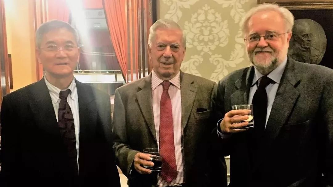 陸經(jīng)生教授(左一)與諾貝爾文學(xué)獎獲得者略薩院士(中)和《新編西班牙語語法》總主編博斯克院士