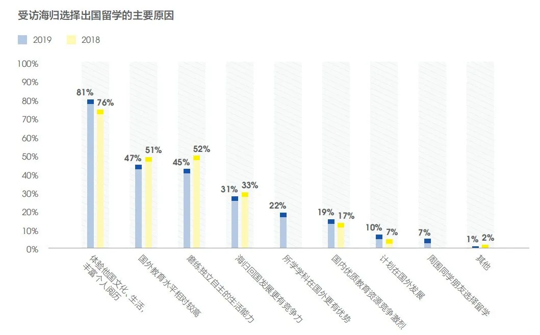 “體驗他國文化、生活,豐富個人閱歷”成為了海歸留學的最重要原因,占比81%。這也說明了中國經(jīng)濟的發(fā)展,使得越來越多的家庭有能力送孩子出國留學。