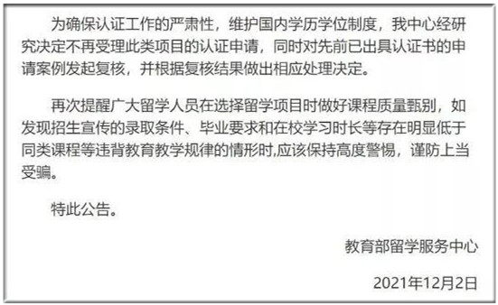 留學生享受落戶政策的前提,是選擇正規的留學項目。對于市場上宣傳所謂簡單入學、學習輕松甚至配備中文翻譯的留學項目,中國教育部留學服務中心、中國留學網、使領館多次發布提醒,通過此類項目取得的學歷證書不予認證。同時對先前已出具認證書的申請案例發起復核,并根據復核結果做出相應處理決定。