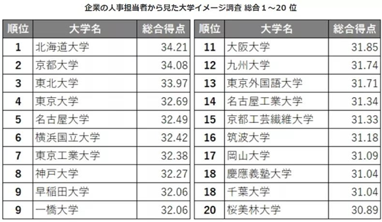 這是日經HR發布的「企業人事負責人眼中的大學形象調查」結果,調查實施的時間為2021年2月15日~3月22日,調查對象為4850所公司,最終有834所公司參與回答,然后根據回答選出了前20名。