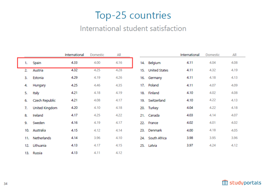 根據 2021 Studyportals Student Satisfaction Report,西班牙、奧地利、愛沙尼亞、匈牙利和意大利位列前五名。英國排名第七,在英語學習目的地中排名第一。其他 “四大”英語目的地包括澳大利亞(第 10 位)、美國(第15位)和加拿大(第21位)。