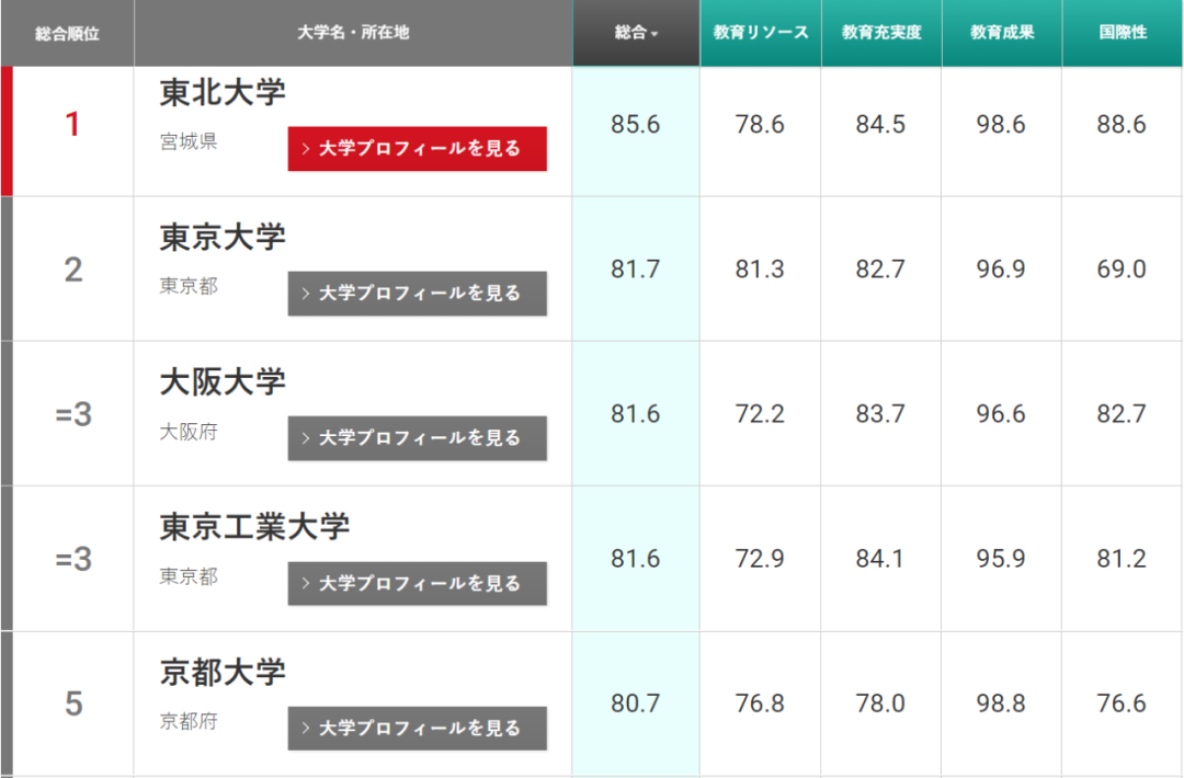大阪大學排名上升兩位(去年第五),和東京工業大學(去年第二)并列第三。京都大學(去年第四)位居第五。