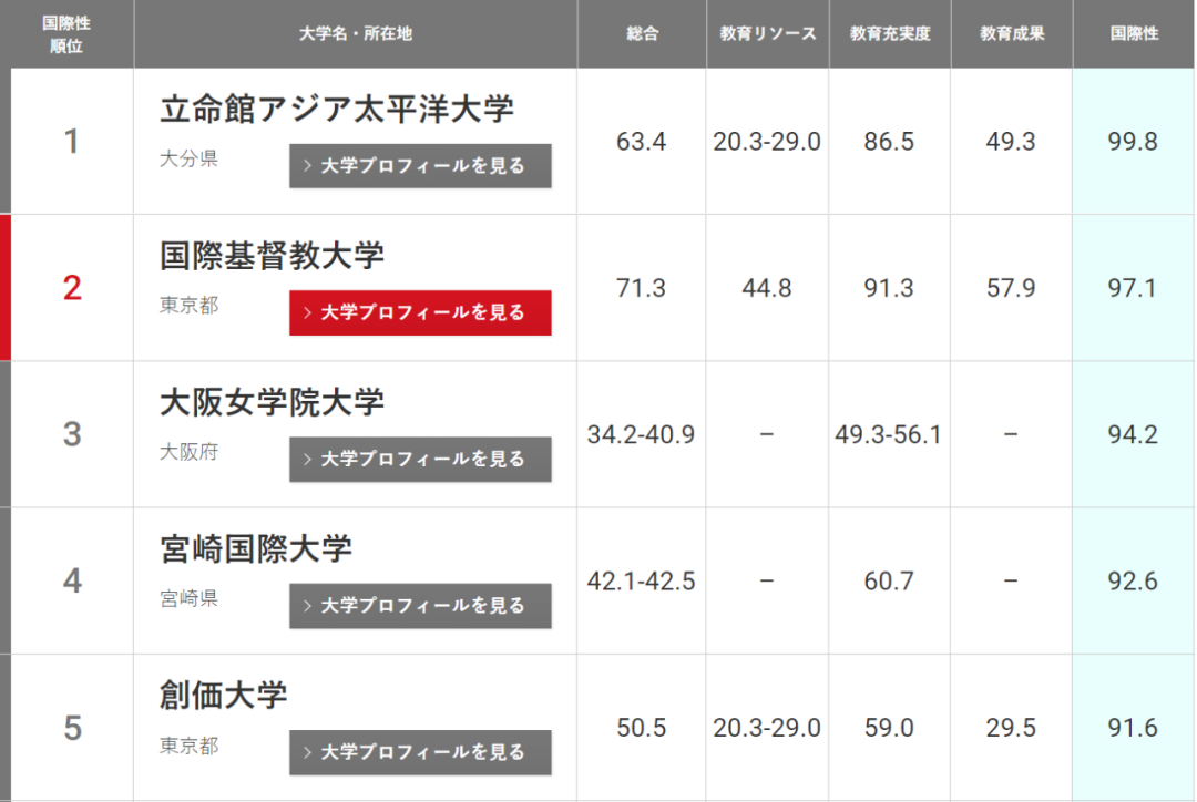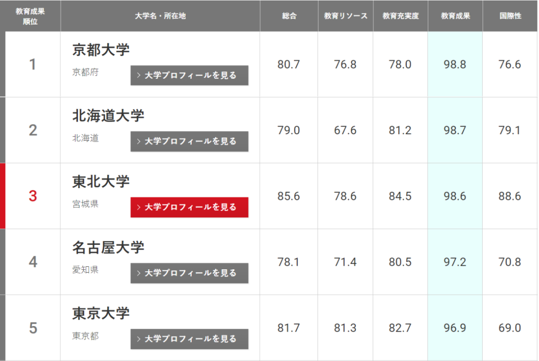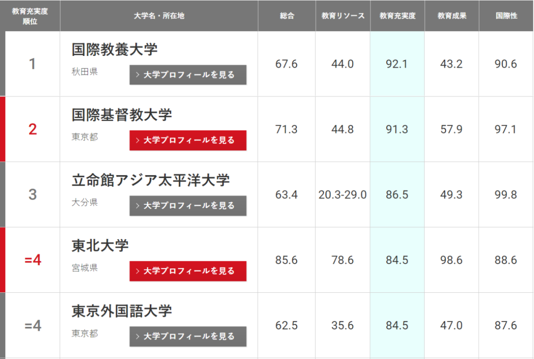 至于各個領域的排名,有三個領域的榜首大學保持不變,即東京大學在 “教育資源”、秋田國際大學在“教育充實度”,京都大學在“教育成果”方面均保持了日本第一的位置。而立命館亞洲太平洋大學首次在 “國際化環境”領域排名第一。