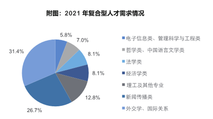 從近五年趨勢(shì)來(lái)看,復(fù)合型人才需求占了多數(shù),學(xué)科融合發(fā)展成為必然趨勢(shì),對(duì)掌握相關(guān)語(yǔ)種和其他專業(yè)知識(shí)的復(fù)合型人才的需求迫切。