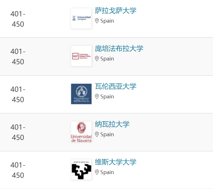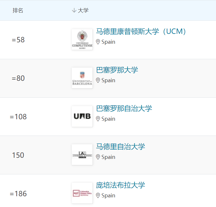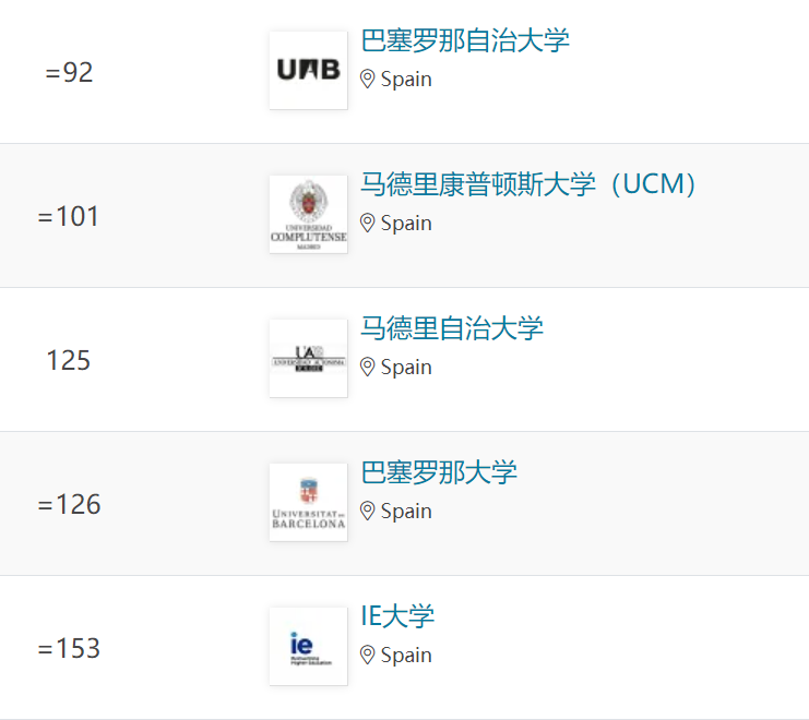 納瓦拉大學、龐培法布拉大學、拉曼·魯爾大學、卡洛斯三世大學和巴塞羅那自治大學躋身世界百強之列。