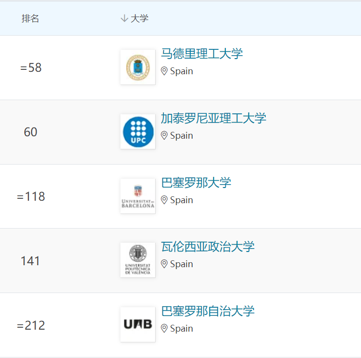 馬德里理工大學、加泰羅尼亞理工大學位列全球百強。