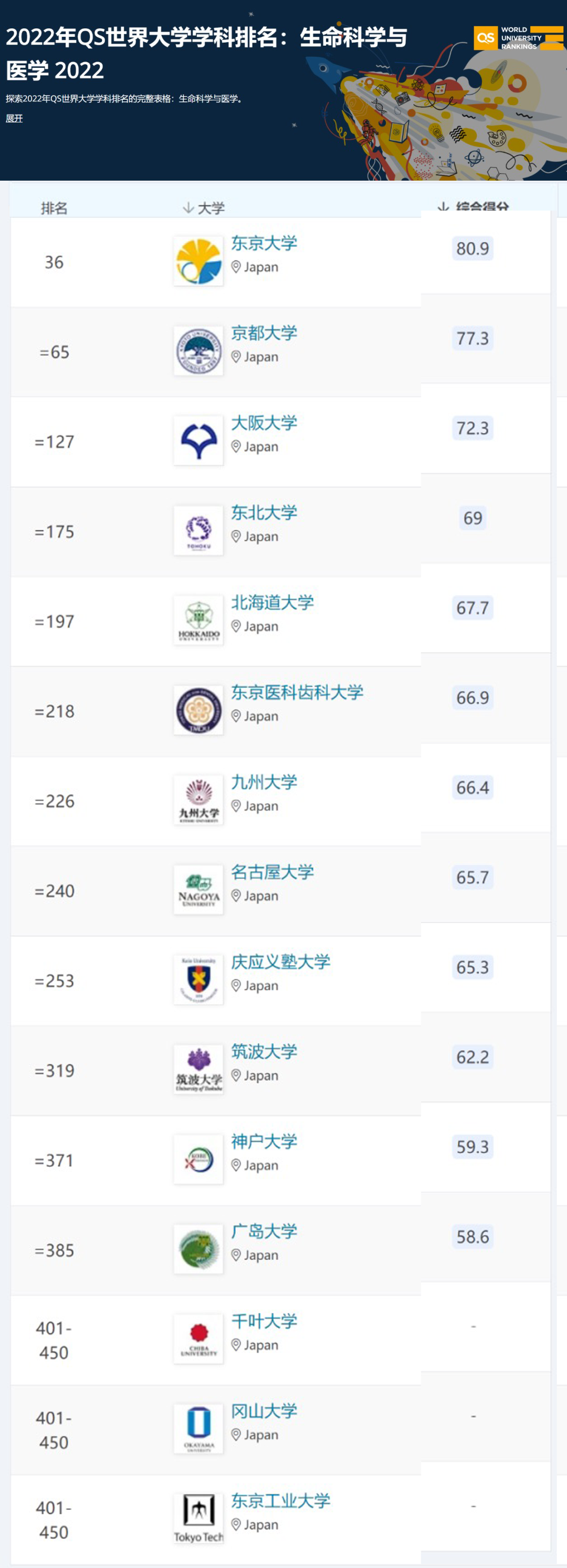 東京大學(xué)、京都大學(xué)、早稻田大學(xué)排名前100;應(yīng)慶義塾大學(xué)和大阪大學(xué)排名前200;名古屋大學(xué)、東京工業(yè)大學(xué)、北海道大學(xué)等排名世界500強(qiáng)!