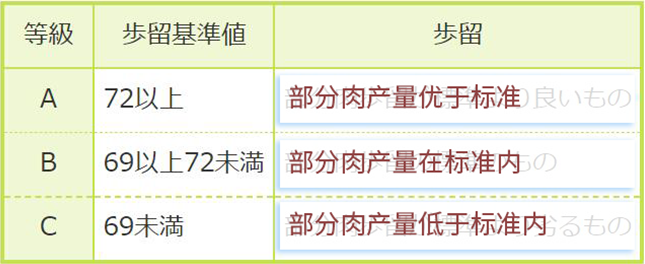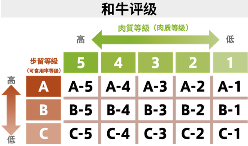 【歩留等級(jí)】由英文字ABC代表,含義是可食用率,按去除內(nèi)臟、皮之后一整頭牛可取得的食用肉比例多寡來(lái)分級(jí),A為最多,C為最少。