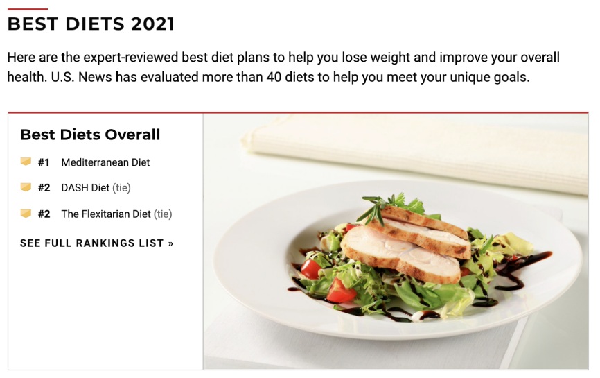 2021年,U.S.News&World Report發布了一年一度的最佳飲食榜單,位居首位的依舊是“地中海飲食”,這也是地中海飲食連續第四年位居全球最佳飲食榜首。