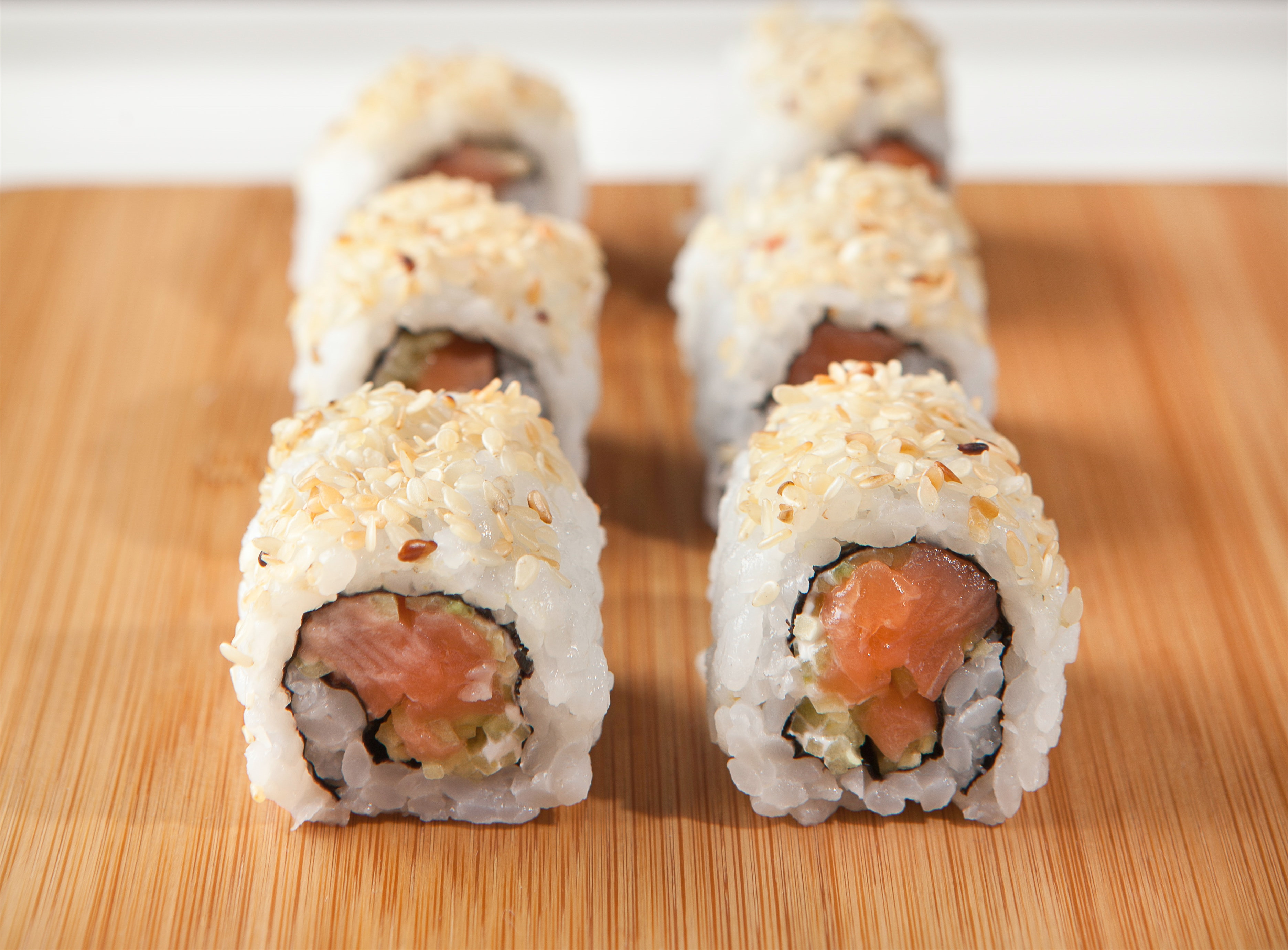 里卷壽司(ura-maki)用海苔包裹配料,米飯露外層。最初是為不習(xí)慣吃生魚貝類和外面包裹海苔這種感覺的外國人設(shè)計(jì)的,所以就將米飯反過來包住海苔和其他食材,最外層還可點(diǎn)綴芝麻、魚籽、蟹籽等。