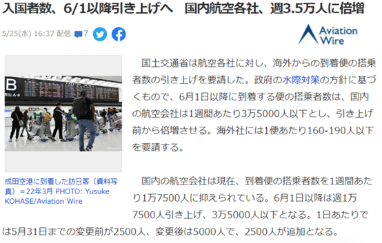 日本國內的航空公司現在每周將到達航班的搭乘人數控制在17500人左右。6月1日以后每周將增加17500人左右,人數控制在35000人以下。每日的人數由2500人變更為5000人,追加2500人。