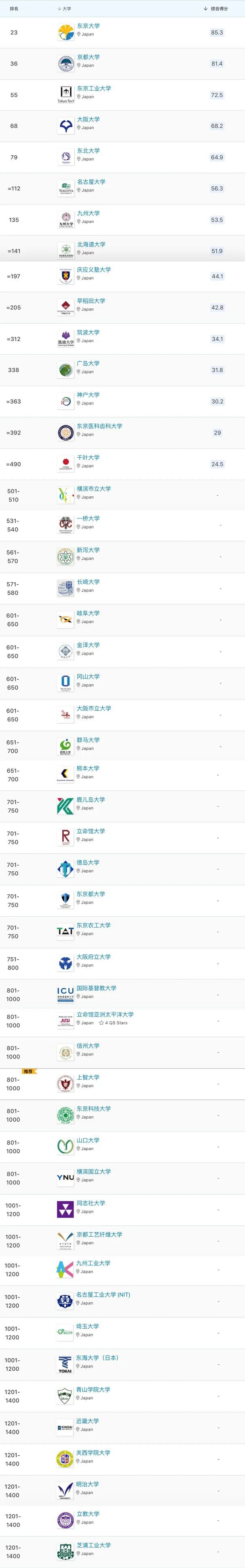 日本共有50所大學上榜,其中15所大學位列世界500強大學,分別是:東京大學(No.23)、京都大學(No.36)、東京工業大學(No.55)、大阪大學(No.68)、東北大學(No.79)、名古屋大學(No.112)、九州大學(No.135)、北海道大學(No.141)、慶應義塾大學(No.197)、早稻田大學(No.205)、筑波大學(No.312)、廣島大學(No.338)、神戶大學(No.363)、東京醫科齒科大學(No.392)和千葉大學(No.490)。