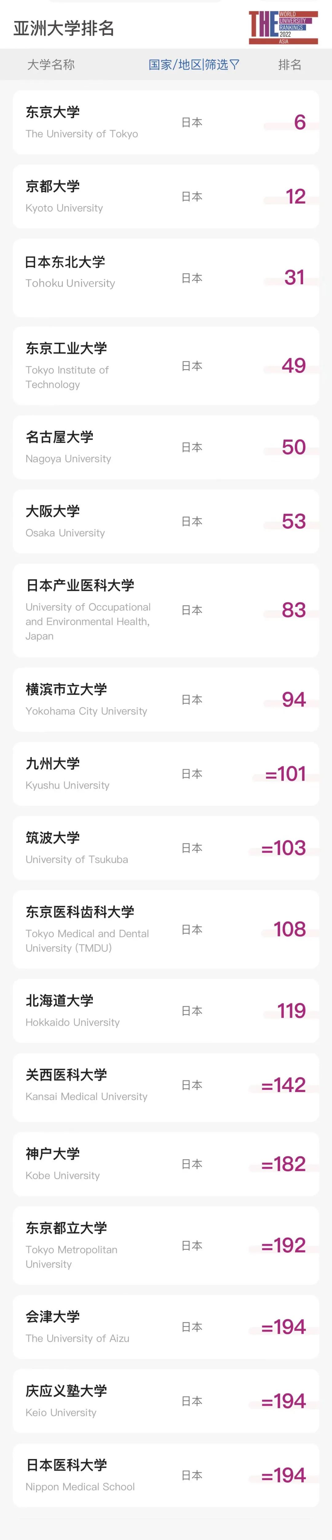 2022年度泰晤士高等教育亞洲大學排名正式揭曉,依托排名評選出來自亞洲30個國家和地區中最好的大學和學院。