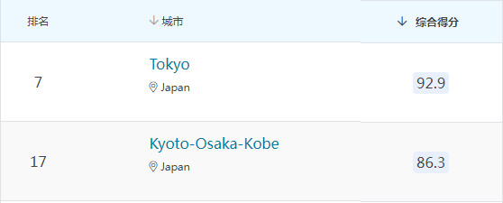 日本的最佳留學城市表現優異,東京排在NO.7的位置,關西地區的京都-大阪-神戶位列17名,躋身世界前20!