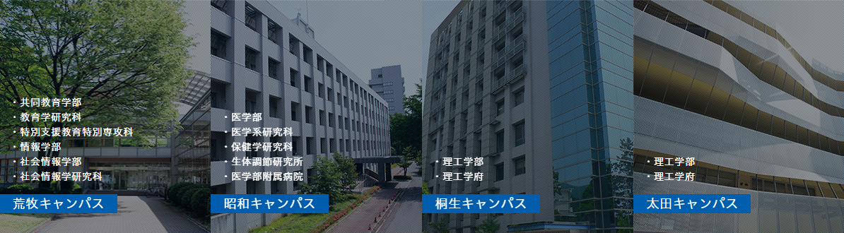 大學(xué)目前有四個校區(qū):前橋市荒牧地區(qū)(教育學(xué)部和社會信息學(xué)部所在地)、前橋市昭和地區(qū)(醫(yī)學(xué)部所在地)、桐生地區(qū)(工學(xué)部所在地)。
