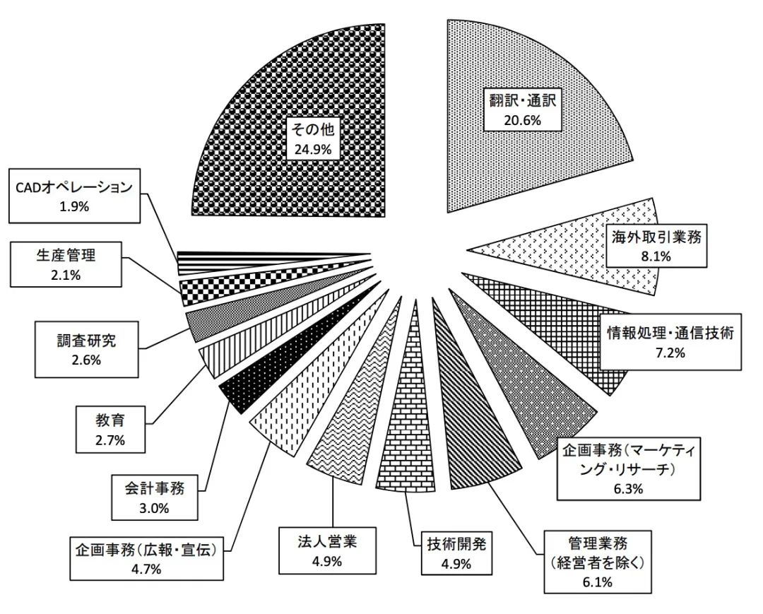 這些工作簽證在申報時所填的具體從事的業務內容是什么?主要工作內容為翻譯口譯的占到了20.6%(一般不會只做翻譯工作),人數為最多。其次是涉及海外國際業務的占8.1%,情報處理和通信技術(IT相關產業)的占7.2%。
