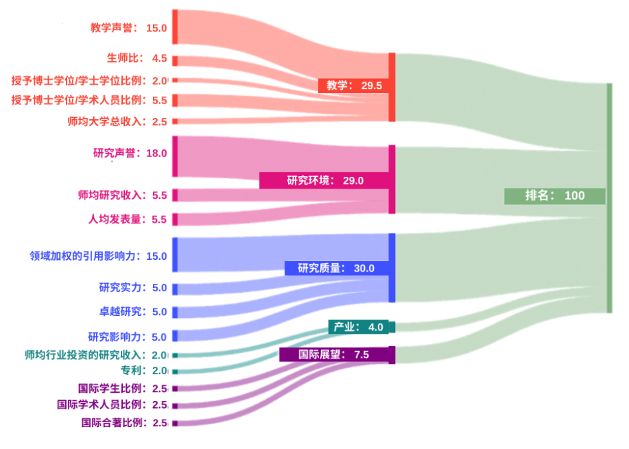 9月27日,2024年THE泰晤士世界大學排名公布。排名使用5個大類18個具體指標來進行排名,增加了研究實力、卓越研究、研究影響力、出境交換生以及專利5個細分指標,具體權重如下: