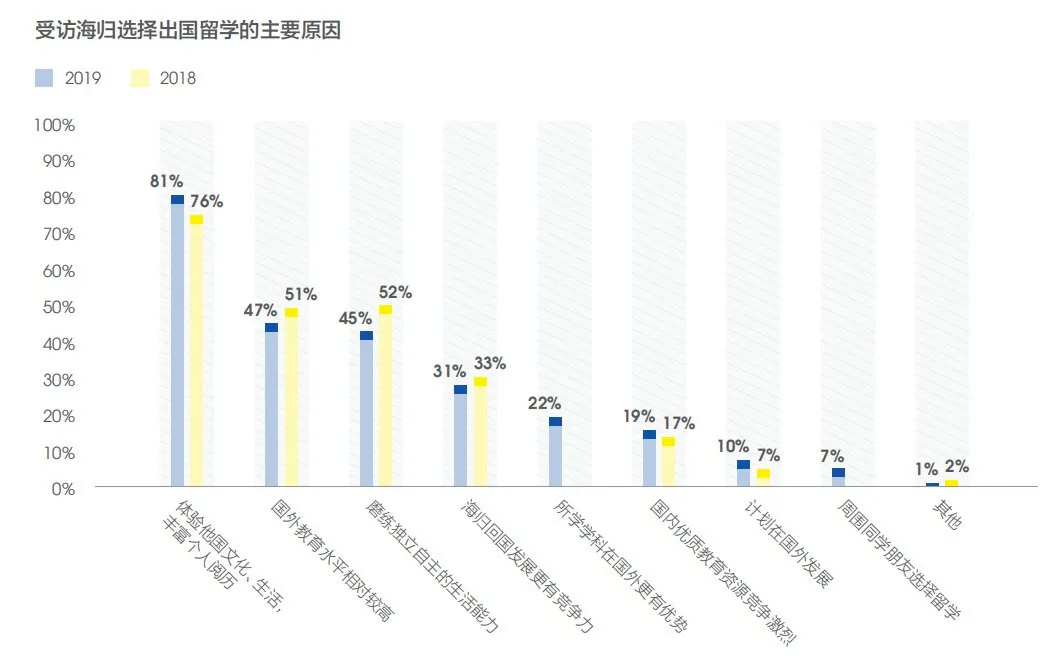 “體驗(yàn)他國(guó)文化、生活,豐富個(gè)人閱歷”成為了海歸留學(xué)的最重要原因,占比81%。這也說(shuō)明了中國(guó)經(jīng)濟(jì)的發(fā)展,使得越來(lái)越多的家庭有能力送孩子出國(guó)留學(xué)。“國(guó)外教育水平相對(duì)較高”和“鍛煉獨(dú)立自主的生活能力”則為第二、第三大原因,占比分別為47%和45%。