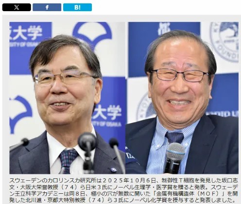 2025年10月6日至8日,日本科學家坂口志文(大阪大學)和北川進(京都大學)分別獲得諾貝爾生理學或醫學獎、化學獎,實現3天內連獲兩項諾獎的突破。