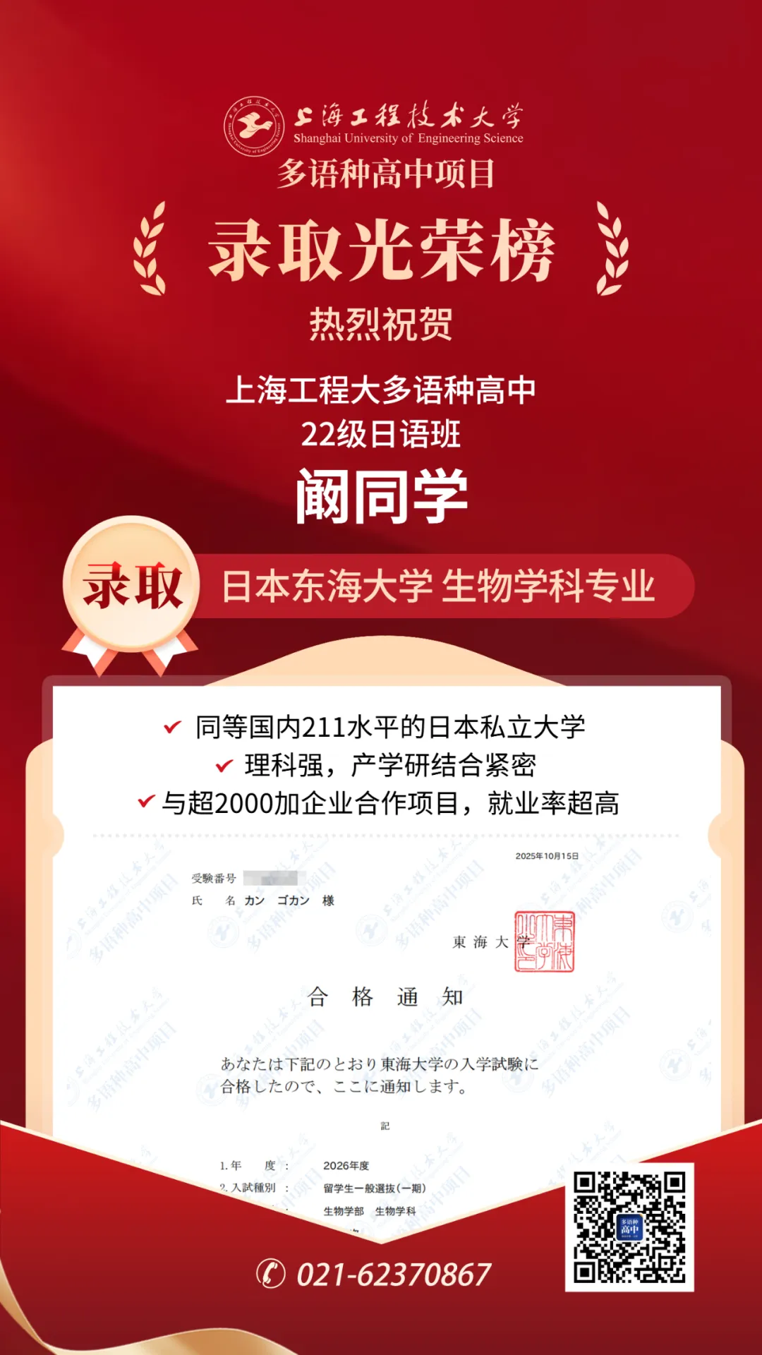 恭喜闞同學(xué)錄取日本東海大學(xué)生物學(xué)科專業(yè)