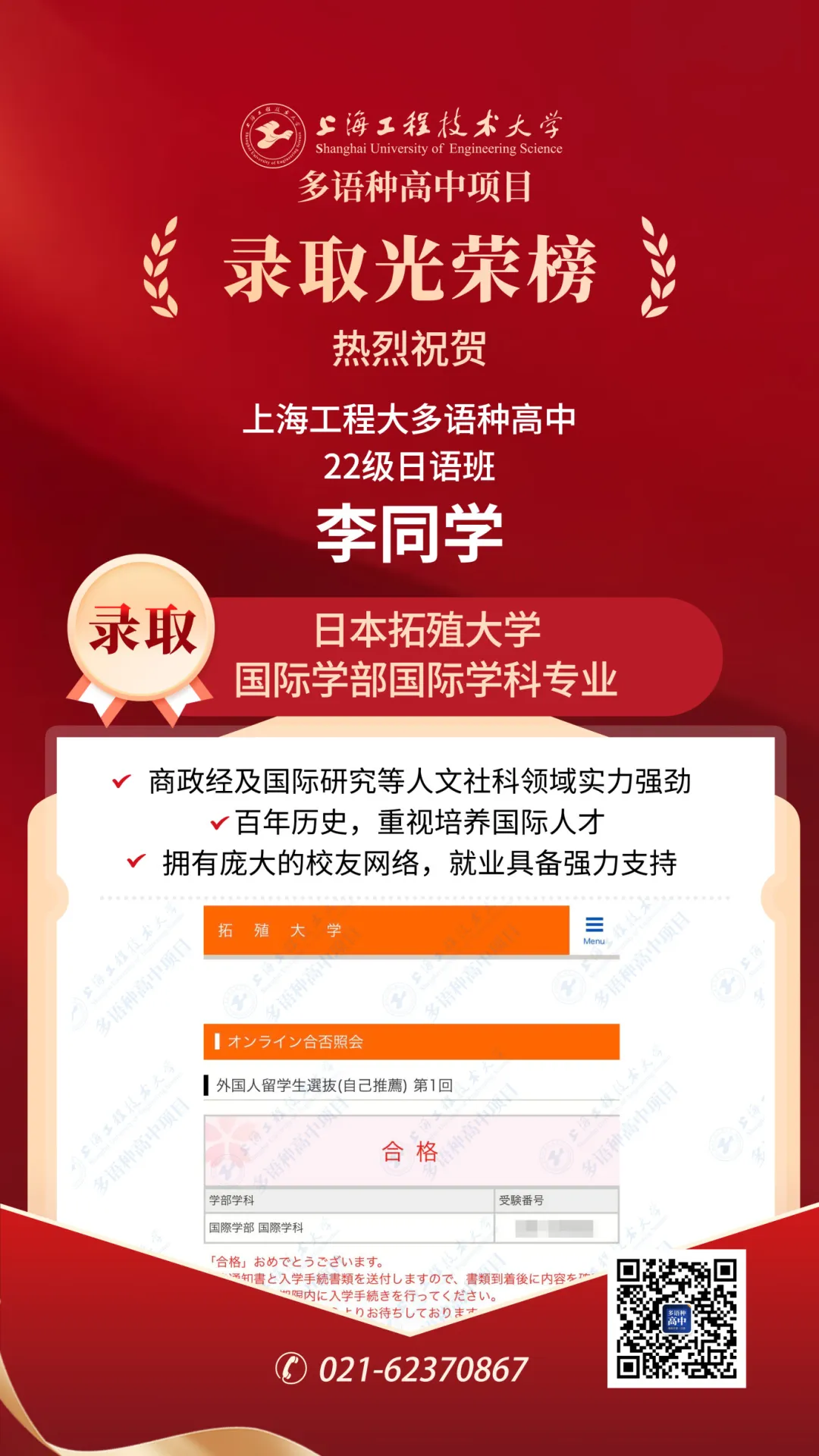 恭喜李同學(xué)錄取日本拓殖大學(xué)國際學(xué)部國際學(xué)科專業(yè)